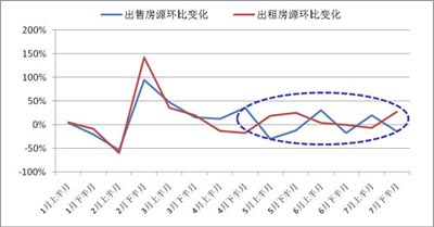 新政前出售房源與出租房源的環比變化基本都具備一定的季節性,即春節后出現高峰期,此后增速逐漸回落;而新政后初期,出售房源增長迅速,此后迅速回落,反之租賃房源開始明顯上漲,也就是說租賃房源上漲或下跌,比出售房源恰好滯后了一個周期。也就是說,此前二手房與租賃市場供應各自發展的軌跡,再新政后開始有了“微妙”的聯系,業主從競相出售到轉售為租,開始對租賃市場有所影響。