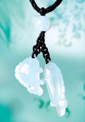 白色翡翠:雙魚造型,兩條魚并不相同,格外趣致。白色是樸素、雅致、貞潔的顏色。能中和任性、依賴、拘泥、悲觀、風流多情、多愁善感、不切實際、感情脆弱等性格缺點。
