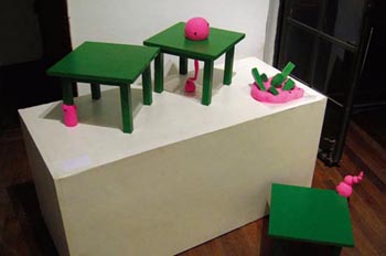 space”,途中一共問了6個交通協管員。這是一幢帶花園的小洋樓,仔細尋找一番后,終于在門口看到了關于這個展覽的小小招貼—巴掌大的招貼用纖細的文字告訴你:就在這里。這讓我想起星爺版《鹿鼎記》中韋小寶在菜市場尋找天地會分舵的一幕。展廳大概10平方米,里面擠滿了“藝術發燒友”。當時我就在想,做這樣的展覽真好,只要來五六個人,就感覺濟濟一堂了。 楊腸筱道,這個名字來自這次展覽的兩位女藝術家,胡筱瀟和陸楊?吹剿齻儠r,胡筱瀟正在給每位來賓分發她的藝術材料,一種顏色奇艷、介于雕塑泥和軟糖之間的泡沫,她就是用這種古怪材料加上幾只仿真蒼蠅、幼兒園的木質小板凳,糾纏在一起做出的作品。當看到每一位來賓一邊談話,一邊手里都不知不覺把她的泡沫泥捏成稀奇古怪的形狀時,我知道,胡筱瀟又在得意了。我們都已經不自覺地成了她作品的一部分。然后她還用非常劣質的木框把自己寫的類似童話、詩歌或者小說的文字框起來,一絲不茍地譯成英文。真有不少人在認真地試圖讀懂其中的意思。這就是小空間的好處,空間太小人太多,當你不認識什么人也無話可說的時候,最好就是假裝去思考作品的深刻含義。 陸楊的作品和她的長相一樣,貌似清秀,但這是假象。她喜歡很和藹可親地給你講述一件無比殘酷的事情。她的作品用很清秀的手繪圖片和很干凈細膩的文字,告訴你很多種新奇的自殺方式。對殘酷的迷戀,或許是80后新人的某種集體愛好吧。