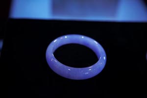 天然翡翠游龍如意紫玉璧:質地細膩晶瑩,雕工精細,紫色濃艷純正,均勻遍布。翡翠紫如意象征事事順心,圓滿如意,紫氣東來。如意上生動地浮現著一尾螭龍,自古以來螭龍寓意美好、吉祥的事物,同時也象征男女之間融洽的感情。在濃正紫色的翡翠襯托下,螭龍顯得格外矚目,如此完美的結合是值得收藏的珍品。 天然翡翠紫氣東來萬福鐲:質地細膩潤澤,無一絲綹裂,傳統的圓條款式洋溢著古典韻味,紫色濃艷純正,令原本傳統的設計帶有時尚感,其造型象征和諧圓滿,有傳承意涵。手鐲與如意以同一材料分割而成,兩者的結合實屬絕美搭配。
