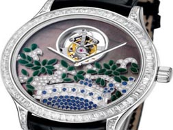梵克雅寶花園系列腕表以世界四大經典花園為創作靈感,點綴寶石及美鉆,彰顯各地的自然風情與獨特的文化韻味。腕表采用白K金制作表殼,表圈鑲嵌方形美鉆,讓琺瑯表盤沉穩內斂的主題更顯亮麗。半圓磨光琺瑯上,藍寶石、鉆石等描繪出英式花園的迷人景致,小橋流水、枝繁葉茂都帶來春回大地的喜悅,其靈感來源于維多利亞花園繁華盛放的景象。除了珠寶鑲嵌、琺瑯工藝以外,腕表亦結合了陀飛輪工藝。腕表裝載陀飛輪旋轉機芯,其框架位于表盤12時位置,有效地抵消方位差的影響,讓走時更精準。