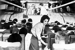 還有一點與現在不同的是:那時候航空公司能提供的服務很受局限。那時候乘飛機穿越美國通常都要?亢脦状,而且中間很可能必須換乘別家航空公司的飛機?ㄋ圭暾f,“你沒法從起點直接到達目的地! 這一現狀在上世紀60時代末70年代初有所改觀,這一時期被譽為航空業的又一個黃金時代,噴氣式飛機大量涌現,取代了活塞引擎式飛機。兩相比較,前者更可靠也更安全。 噴氣式飛機可以搭載更多的乘客,速度也快了很多,因此航空公司就有了大量的座位可以出售。他們在機艙內安排了非常寬裕的伸腿空間──比如今經濟艙每排之間的空間多了3至6英寸。此外還有很多空位置可以讓旅客自由舒展身體。飛機的載荷系數或者說乘坐率,在1968年是45.9%,2009年則是80.4%。 為了吸引新乘客、籠絡常旅客,航空公司各出高招相互競爭:可口的飯菜啦,穿著熱褲和迷你裙的空姐提供無微不至的機上服務啦,極富挑逗意味的“跟我一起飛”的廣告啦,等等。 波音747飛機于1969年投入航線運營,為普羅大眾開啟了國際飛行之門,在當年,其頭等艙里設有鋼琴酒吧,即便是經濟艙,通常也會有三種套餐可供乘客選擇。 航空業顧問斯坦利普羅格(Stanley