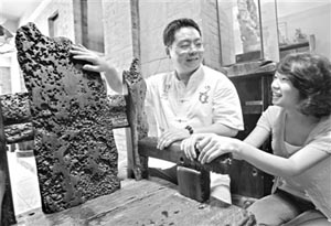 張有峰(左)正對著一塊老船木與讀者探討設計方案