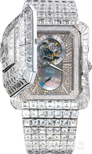 .35克拉祖母綠切割美鉆,奢華無比。輕觸第一枚鉆石按鈕,白色珍珠貝母表盤緩緩出現在眼前,設計簡約,光澤獨特迷人,時間刻度由方形切割美鉆鑲嵌而成,配備伯爵56P石英機芯。而按下第二枚鉆石按鈕后,即能欣賞浮動陀飛輪機芯的美妙運作。得益于在超薄機芯領域的深厚功力,雙層腕表一直是伯爵的拿手好戲,一枚鑲滿鉆石的雙神秘開關設計腕表不僅將伯爵善于結合頂級珠寶與制表工藝的特質發揮得淋漓盡致,更讓這枚腕表成為一件獨一無二、美不勝收的藝術品,達到登峰造極的完美境界。