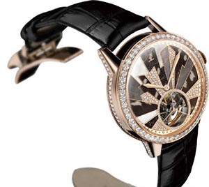 以多種極富女性魅力的元素裝飾陀飛輪腕表,是積家這款女裝陀飛輪腕表最吸引人眼球之處。這種流光溢彩的組合方式,不僅完美地將陀飛輪裝置與精湛的裝飾工藝融為一體,更展現出優雅細膩的不凡氣度。腕表以18K玫瑰金制造表殼,直徑39毫米,更適合女性纖細的手腕。表盤設計靈感來源于裝飾藝術風格,珍珠貝母、璀璨美鉆和美麗的羽毛拼鑲出簡潔大氣的幾何圖案,華美中不乏現代女性特立獨行的氣質。腕表搭載積家978型自動上鏈機芯,動力儲存45小時。絹質表帶,搭配鑲嵌鉆石的金屬折疊式表扣。此外,腕表亦有白金版,其中18K玫瑰金款鑲嵌315顆重約2.9克拉鉆石,白金款鑲嵌341顆重約3.2克拉鉆石。