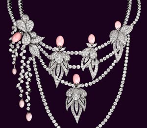 都比它第一眼看上去要復雜的多。正像要佩戴珠寶的女人一樣,只能在近距離欣賞的時候,才能充分品味珠寶背后的魅力所在。一眨眼的工夫,中央的裝飾圖案會變成一個胸針,吊墜變成耳環,或一個復雜的項鏈扣變成一個發夾。每一款式都具有多種功能,將誘惑的藝術變成佩戴珠寶女人欲望所主宰的游戲。