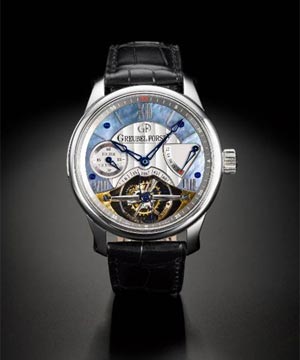 型號雙體陀飛輪腕表,備72小時動力儲存顯示及貝母表盤,年份2004,編號2(估價160萬至240萬港元/20萬至30萬美元)。此枚腕表是兩位制表名師