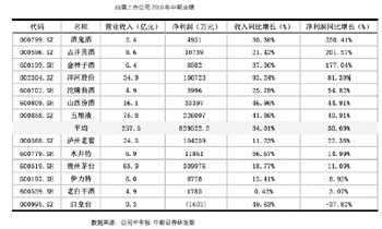 海通證券對白酒上市公司的中報進行分析稱,上半年白酒上市公司收入利潤合計增速維持高位,主要在于2009年上半年基數較低:13家白酒上市公司上半年實現收入257.5億,同比增長34%,其中一季度收入增長35%,二季度收入增長33%,上半年實現凈利潤83億,同比增長30.7%,其中一季度凈利潤同比增長28%,二季度凈利潤增長34.5%。 報告預計今年下半年白酒企業收入將逐步放緩至平穩狀態10%左右,但下半年合計凈利潤增速仍將維持高位,同比增長將達約35%左右。預計全年13家白酒上市公司合計收入和凈利潤增速分別為19%和29%左右,這個增長速度仍舊足以讓白酒股獲取超額收益。從6—7月份高檔白酒終端零售價的普漲來看,估計很多白酒公司三季度的發貨量將得到可靠保障,經銷商補庫存的過程可能將一直延續到明年春節。 海通證券認為,上半年白酒企業凈利潤增速低于收入增速主要是因為消費稅率提高了2—3個百分點,但下半年翹尾因素逐步減弱,凈利潤增速將逐步恢復。中國政府從2009年下半年開始提出從嚴增收消費稅,而公安部門也在去年底從嚴打擊酒駕,并于今年4月份嚴格規范交通法。中長期來看,無論是酒精飲料的消費稅,還是其他行政、法律,對酒精飲料消費的限制力度都會提高。中長期來看,“少喝酒、喝好酒”是大勢所趨,白酒業中長期產品結構調整仍將深化。