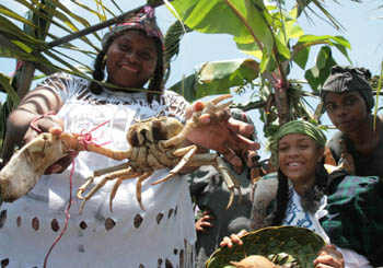 與陽光共同躍動的加勒比音樂,與腰肢一起搖曳的蘆葦草裙,熙熙攘攘的人群,鮮美的螃蟹海鮮湯和金黃色的烤魚,這就是尼加拉瓜加玉米島上每年8月末都要上演的重頭戲——螃蟹節。 由首都馬那瓜出發,乘坐只能容納9人的微型螺旋槳式飛機,經過約兩小時的空中顛簸,記者終于來到了位于尼加拉瓜東南部加勒比海域的玉米島。這座小島方圓幾十平方公里,終年氣候溫潤,雨量豐沛,隨處可見高大挺拔的棕櫚樹和椰子樹。還沒來得及細細欣賞熱帶島嶼的美景,皮膚黝黑的當地漁民已經開始熱情地招呼我們參加“螃蟹節”的慶;顒。 只見數千名當地居民和觀光客都聚集在一個接近海邊的廣場,觀看盛裝舞者的表演。廣場中央,古銅膚色的加勒比少年頭戴面具,腰圍草裙,手持標槍,正在重現祖先勇斗敵人和猛獸的場景;笑容甜美的加勒比少女則頭纏絲帶,手持椰子殼做成的工具,為游人展示捕捉魚蝦螃蟹的技巧。一只只用彩色紙張糊成的大魚小蟹徐徐“游過”他們的身邊,顯得既生動又新奇。不少漁民還將自家打撈上來的螃蟹拿出來炫耀,和歌舞表演交相呼應的,是四周擺放的各類當地小吃和節日大餐。心靈手巧的加勒比婦女利用一切可以找到的原生態材料來準備這場節日的盛宴,她們在路邊架起大鍋,為游人熬制最具熱帶海島風情的“海鮮螃蟹湯”。洋蔥、番茄、螃蟹、魚肉和椰子,這些原料被主婦們放在一起熬制數個小時,再將乳白色的湯汁盛入干椰子殼做成的碗中,就做成了一道最令人流連忘返的美味佳肴,如果還能配上一份用蘆葦葉包裹的紅豆飯,那種滋味匯聚在游人的口中和心里,最終將化作對大自然美好的感嘆。在這里,所有人都忘卻了喧囂都市中的百般禁忌,隨處可見載歌載舞的游人和大快朵頤后仍意猶未盡吮吸手指的食客。 關于“螃蟹節”的由來,還有著一段曲折的歷史。據當地人說,168年前,尼加拉瓜加勒比地區的民眾飽受奴隸制度的剝削和折磨,后來人們通過努力廢除了舊制度,獲得了自由幸福的生活。自此之后,每年的這個時候,當地居民都要穿上最漂亮的衣服,制作最美味的食品,通過舞蹈和歌聲,來表達心中對美好生活的無限憧憬,對大自然饋贈的感恩之情,同時還要祈禱來年的風調雨順。 加勒比海淺藍色的浪花拍打著海岸,溫暖的海風輕輕吹過玉米島上歡慶的人群。如今,盡管奴隸制度已經風吹云散,但曾經的勝利和喜悅卻沿襲至今。慶!绑π饭潯钡莫毺亓曀滓呀浽谀峒永先水斨性烁,一定還會代代相傳。