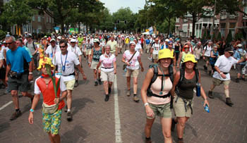 7月20日凌晨3點,荷蘭西部小城奈梅亨。盡管正值夜最深沉之時,卻有一大幫人成群結隊地開始穿城而行。這些人既有英姿颯爽的各國軍人,也有頭發花白的耄耋老者,還有青春活潑的少年學生,而更多的,則是普普通通的民眾。 上述這一幕如果讓不明其由的人看起來,似乎頗有些怪異,但實際上,它卻是一場多達4萬人參加的節日的序幕——奈梅亨4日徒步節。 世界上的節日千奇百怪,但是以走路為主題而進行狂歡的節日卻甚為少見。1909年,奈梅亨當地的一些人開始組織一項徒步活動,最初僅僅是針對軍人而設立的。但是隨著近百年來的發展,這項全球最古老的徒步活動如今已經吸引了越來越多的普通民眾參與,成為全球規模最大的多日徒步活動。而且,雖然活動以徒步行走為主題,但是在徒步行走開始之前,整個奈梅亨小城都會陷入一連幾天的狂歡,大型歌舞、盛裝巡游等等,讓盛夏的艷陽為人們宣泄激情提供最好的陪襯。 據活動主辦方介紹,今年的徒步節盛況空前,由于報名者太多,組委會不得不抽簽“淘汰”了約3000人。來自23個國家和地區的軍人以及60多個國家和地區的各界民眾,分為30公里、40公里和50公里3個組別,從20日凌晨開始了連續4天的徒步行進。換言之,參加徒步節的選手,最高需要在4天時間內連續行走200公里。 由于往屆活動中出現過高溫天氣導致民眾發生意外的情況,因此組委會今年特別安排選手們凌晨3點出發,以避開高溫。選手們從奈梅亨市區出城,沿鄰近城鎮繞行,并最終回到市區。 時值盛夏,盡管選手們從凌晨就開始陸續出發,但是在行走了約摸三四個小時之后,正值疲勞襲來之時,太陽卻又躍上頭頂,無疑成為對人們意志的最大考驗。許多選手都在脖子上搭條汗巾,而許多住在沿途的民眾也自發為選手們送上飲料。炙熱的驕陽,枯燥的行走,但是整個隊伍中卻不乏歡聲笑語,整個活動充滿了歡快的氣氛。 一位荷蘭老先生對記者說:“我參加這個活動已有10多年了,以往都是參加50公里的,只是今年歲數大了,才改成40公里!绷硪幻商m中學生告訴記者:“我是聽朋友介紹才知道這個活動的,當時就覺得很有意思,很想參加。今年我是第一次參加這個活動,我也不知道能不能堅持走完4天,但是我想挑戰一下自己! 直至午間時分,開始陸續有人抵達終點。依然保持整齊隊形前進的,無疑是各國的軍人;而更多的人則在抵達終點的瞬間擺出各種各樣慶祝的POSE——或者作出勝利的姿勢,或者將汗巾拋灑向天空,或者與伙伴擊掌相慶…… “走路確實是件很平常,很單調,甚至會讓你覺得有些無聊的事情,但是能夠和幾萬人一起行走,一起挑戰自己,我覺得這會給我帶來莫大的快樂”,一位選手在抵達終點后說,“在這樣炎熱的天氣里,自己的汗水浸濕了衣服,而我也得到了最好的鍛煉,不僅僅是身體上,更關鍵是我自己的意志!
