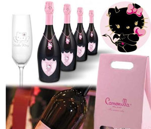 (Hello Kitty) 公司和一家葡萄酒商合作,推出了瓶身貼著凱蒂貓 (Hello Kitty) 肖像和掛著它吊墜的葡萄酒。沒有嘴巴的凱蒂貓 (Hello
