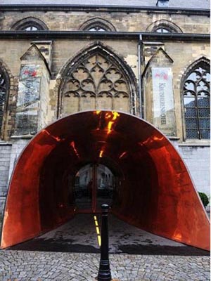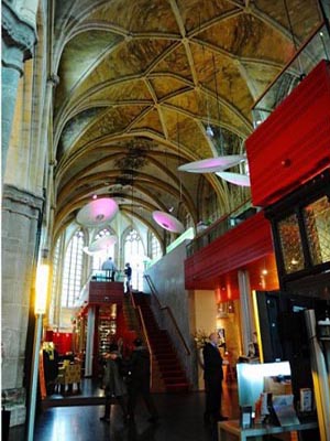 繞過老教堂,后面一座古老的建筑便是著名的柯瑞舍倫酒店(Kruisherenhotel),一所教堂改造的五星級豪華酒店。一個金色的大喇叭竟然就是酒店的入口,看起來有點不倫不類,不過當入口那端的自動門打開時,豁然開朗,一座漂亮的教堂大廳出現在眼前。