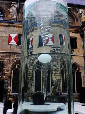 原來教堂的中庭,外面一座玻璃水柱不知其用途,走近,突然原本靜止的水柱里面水面翻騰起來,從頂端開始出現一個漩渦,不停旋轉,看樣子里面大有玄機,不一會,一個白色的圓球在水柱的旋轉中逐漸降下,漩渦越來越大,這個裝置竟然是感應的,只有當有人過來時,水柱才會轉動,也許只是個裝飾吧。