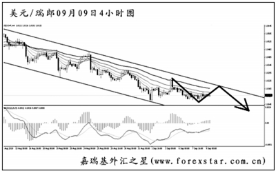 ▲英鎊兌美元發力將下降通道上沿小幅升破,圖中一連串的MACD底背離信號發揮了一定的效果。目前匯價有向下回抽通道上沿的欲望,然后繼續走出一波反彈,但反彈很難升破1.5600一線阻力。后市英鎊有再度遇阻下跌的風險,若做多只屬于短線單性質。