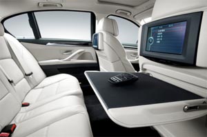 后排都標準配備了音頻系統的控制單元,包括集成在中央扶手中的一個控制器?烧郫B并帶照明的化妝鏡以及前后排的兩個杯座同樣是標準配置。后排獨特的閱讀燈和在乘客向下移動中央扶手時可打開的冷藏箱,作為選裝配置提供。為BMW