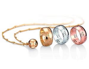 GUCCI2010秋冬Icon系列再現雙G魅力,在戒指、耳環、吊墜和手鏈上推出了雙G互扣圖案。這一標識的衍生序列在以下產品系列中得到了充分詮釋:Icon、Icon Stardust、Icon Twirl和最新創作的Icon Bold和Icon Coin。其中每一個系列都以18K白金、黃金或玫瑰金手工制作,部分鑲有白色、棕色或黑色鉆石以及粉紅色藍寶石。