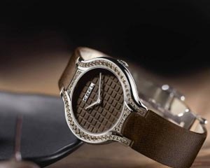 其實Beluga系列從1985年誕生到現在已經有著很長的一段生產歷史了。這次的“巧克力”系列女士腕表表盤由18K白金制造而成,寬37.5毫米,在表盤的外部用68顆珍貴的寶石鑲嵌,與表的顏色一致。