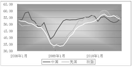圖1:2008年1月-2010年9月主要經濟體PMI指數走勢圖