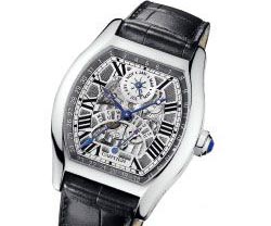 卡地亞的這枚萬年歷表,讓人眼前一亮,原因在于將甚少有變化的萬年歷表盤做出了新意。它以12點位置的圓盤指示月份以及閏年,日歷被安置于表圈。星期顯示則很俏皮地坐落在“彎彎橋上”。Tortue表殼極具傳奇色彩,與整個設計相得益彰。