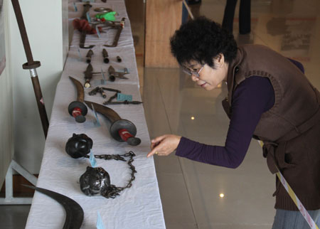 滄州傳統武術器械展近日開展。此次展覽展出的200余件“武術之鄉”河北滄州武術世家及明清時期傳統武術器械珍品,以及一些罕見的明清武術文獻資料,都是由當地民間收藏人士收集、征集到的。所展的武術器械及文獻資料大都是首次亮相。圖為市民參觀展出的古代傳統武術器械。新華社發