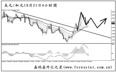 ▲美元兌加元持續的MACD底背離作用展現,匯價大幅反彈上行,上漲動能強勁。從日線圖上看,美元兌加元仍處于動蕩的走勢之中。短線主趨勢已轉為向上,預計后市美元兌加元將回探一下趨勢線支撐,然后繼續上行。操作上以尋機做多為主思路。