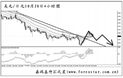 ▲歐元兌美元在跌破上升趨勢線后高位盤整,短線陷入了震蕩走勢。從日線圖上看,歐元的漲勢依舊延續,目前判斷筑頂成功為時尚早。圖中的走勢為一種演變,若匯價形成三角形中繼形態,則后市再創新高并不是一件難事。即使歐元向下突破,還有旗形的下沿具備較強的支撐作用。