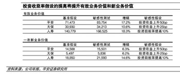 國信證券發布的報告也表示,壽險假設貼現率10%—11%、長期投資回報率4.7%—5.0%、21—24倍新業務乘數,產險、銀行、證券按2倍PB,信托、集團及其他按1倍PB計算,人壽、平安、太保2011年估值分別為35.5元/股、102.1元/股、34.4元/股,分別較目前股價有31.3%、57.1%、27.1%上漲空間。