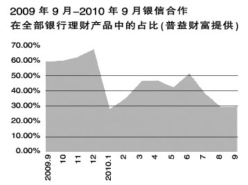 普益財富數據顯示,8月份銀信合作產品發行298款,較7月份下降26.42%,信貸類理財產品僅發行21款,在銀信合作產品中占比不足一成,其中,包括信貸資產投資類產品13款,信托貸款類產品8款;9月份,銀信合作產品發行307款,信貸類產品同樣發行21款,而純信托貸款類產品則絕跡于理財產品行列。