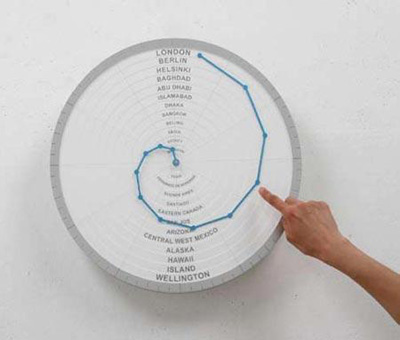Hands只要一個表盤就可以告訴你當地時間。設計師們將時鐘指示設計成螺旋形,在時鐘表面以同心圓的方式標有世界不同城市的名字,當表盤上的時針轉動時,指針所指的時間對應了城市的名字,只要找到指針上的藍色小點就可以知道當地的時間了。