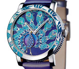 Boucheron近期推出一款孔雀腕表,生龍活現的雕刻設計完美至極,仿佛這是只真孔雀,躍然表中,等到飛翔的那一刻。 Boucheron這次為它那奇怪而又魅惑的“百寶箱”帶來了一只驕傲炫耀的孔雀。這只傲慢而又美麗的孔雀似乎是從中世紀的光芒中一躍而出,棲息在這款具有無窮吸引力的手表上,它代表了最精美的琺瑯、雕刻和寶石鑲嵌藝術。GP4000 “Seconde Folle”全新自動上鏈機械機芯,讓孔雀看上去能夠像活物一般呼吸。仿佛一只披著七彩羽翼的鳳凰,隨時突破表框的束縛展翅飛翔。