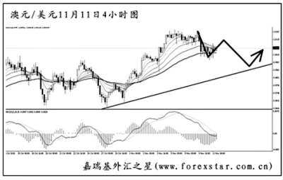 ▲澳元兌美元在突破平價水平之后的運行幅度有限,目前匯價小幅下調,但仍保持在1.0000上方。圖中上升趨勢線為日線圖形成,斜率陡峭,澳元將首先挑戰此位。中線的道氏理論顯著低點在0.9650附近,澳元若想結束其跌勢還將會經歷很大的一段考驗。