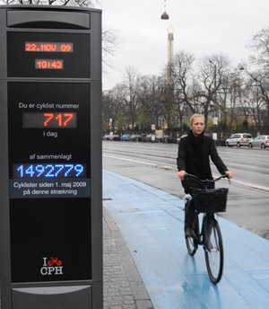 哥本哈根市政府制定了自行車出行的遠景目標,希望到2015年將居民利用自行車上班和上學的比例提高到50%。哥本哈根市政府估計,實現這一目標每年將減少8萬噸的二氧化碳排放量。