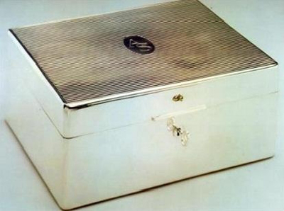 引人注目的—華麗的銀質雪茄盒,有著一定的重量和流行的樣式,它的蓋子做成優雅的線條模式,除了蓋子之外,什么地方都看不到接口,邊棱