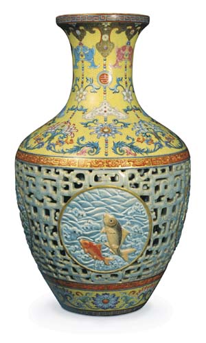 清乾隆粉彩鏤空瓷瓶日前拍出5.5億元人民幣,創下了中國藝術品的拍賣紀錄。新華社/路透 |