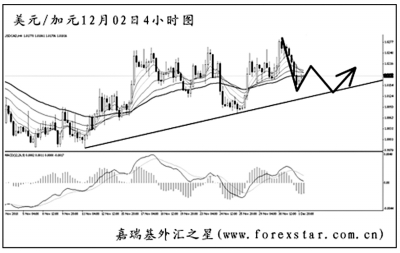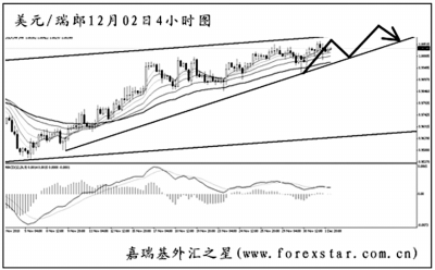 ▲美元兌瑞郎在圖中上升趨勢線的支撐下走高,但短線動能已明顯減弱。同時從日線圖上看,匯價處于一個下跌旗形中繼的上沿下方,能否升破旗形上沿成為美元兌瑞郎后市轉為漲勢的關鍵。目前價格處于被上下夾擊的狀況,建議暫時謹慎入場,最好在突破后采取跟隨的方式交易。