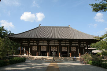 奈良最著名的大寺要屬東大寺,這里還是鑒真大師東渡后為圣武太上皇、光明太上皇后、孝謙天皇受戒之地。而東大寺最享有盛名的建筑要數大佛殿,殿內的盧舍那佛像是日本最大的銅佛,高近15米。當年為給大佛鍍金共使用了約375公斤黃金和2110公斤水銀。不過,如今的大佛殿和大佛都是江戶時代重建的,大殿體積只相當于當年體積的2/3。盡管如此,在奈良西郊當年的皇宮正殿,也能夠清楚地看到東大寺大佛殿巨大的屋頂,大佛殿在近代以前一直是世界最高大的木造建筑物。
