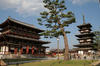 藥師寺的東塔聳立了1300年,西塔是1981年復建的。一座飽經風霜,一座金碧輝煌,相映成趣。東塔實為三層,但是每層下面都有收縮的夾層,看起來是六層,富有節奏感,被譽為日本最美的塔。藥師寺金堂也是這種帶有夾層的結構,所以顯得格外優美。從藥師寺西部稱為“大池”的湖泊遠眺,東塔和西塔高聳的一舊一新的塔剎,富有動感的塔身,金堂寬大雄偉的屋頂,金色的鴟尾——這富有動感的三座建筑組合在一起,巧奪天工,被稱為“凝固的樂章”,是很多攝影發燒友的最愛。