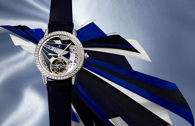 年年初推出的復雜功能款腕表。腕表完美融合機械學與美學,集三種頂級鐘表復雜功能于一身,演出一場"天作"之舞:三問報時、飛行陀飛輪和恒星萬年歷,共同演繹了獻給威尼斯城的完美舞姿。飛行陀飛輪不僅具有調節功能,在展現北半球星空圖的藍色雕紋表盤上,更是恒星時針。層層疊疊的透明效果凸現了魔幻般的高超手工工藝。太陽圍繞表盤一周恰好24