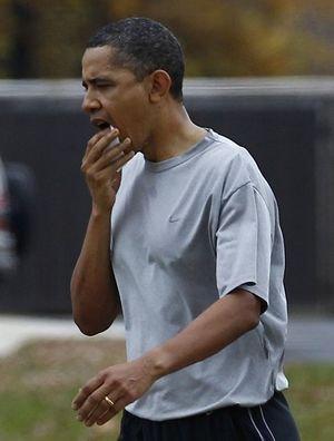這就是發生在11月26日華盛頓麥克奈爾堡軍事基地的一幕。從圖片上可以看出,奧巴馬身著運動衣,手拿紙巾壓著嘴巴,在數名保鏢簇擁下,走上了?吭谇驁鲞叢贿h的總統專車。記者透過車玻璃,拍到了一張奧巴馬坐在車內的照片,奧巴馬看似神情沮喪。