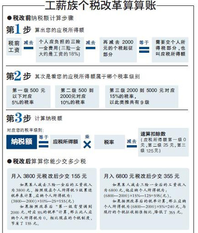 如果按照改革后“第一級有望調到2000元、對應5%的稅率”計算,那么此人應納個人所得稅為0,相比現在的個稅制度,節省了155元。