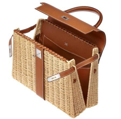 這款“鄉村凱莉包”(Country Kelly)是兩種傳統技藝結合的產物:籃子編制和皮革制作,優雅簡潔,出人意料。兩個藤條外殼通過人字呢系帶與Barenia小牛皮部件—內口袋、袋蓋和挎帶—相連,保證了皮包結構穩固、便于握持?胺Q一款真正的野餐小竹籃。