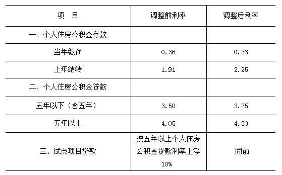 二、從2010年12月26日起,上調個人住房公積金貸款利率。五年期以下(含五年)及五年期以上個人住房公積金貸款利率均上調0.25個百分點。五年期以下(含五年)從3.50%調整為3.75%,五年期以上從4.05%調整為4.30%。