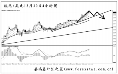 ▲澳元兌美元再度突破了1.0000的整數關卡,向11月初的高點1.0180一線發起挑戰,且價格小幅沖破了此位。目前需要重點關注的是此次突破能否有效站穩其上,否則澳元有向趨勢線支撐發起挑戰的風險,F在澳元的價格已處高位,做多需謹慎。