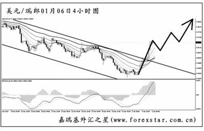 ▲美元兌瑞郎在創出日線圖新低之后強力反彈上行,已經將下降通道的上沿大幅升破。日線收出兩根實體大陽線,即將考驗均線系統的壓制位。圖中顯示匯價上漲的斜率陡峭,MACD多頭動能十分充盈,目前正在考驗0.9665的道氏理論阻力,升破后將展開更為迅猛的上沖走勢。