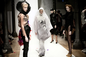 在2011春夏倫敦時裝周大放光芒的丹麥設計品牌DesignerRemixCollection可謂創新派的最好代表。該品牌服裝以素色為主,大氣簡約,渾然天成,善于通過壓褶、堆疊、剪裁、肩部線條等不平凡的細節設計體現出低調的奢華,品質與優雅自然流露。設計師兼創意總監夏洛特?埃斯基爾森(CharlotteEskildsen)曾被提名為“丹麥最好的設計師”,她用“性感、前衛和略帶神秘”來形容這個品牌。
