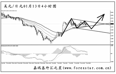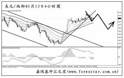 ▲美元兌瑞郎在突破了此前的下降通道上沿后,上沖力度強勁,圖中的均線系統已經轉為向上排列。短線MACD發生了頂背離信號,同時上升趨勢線跌破,后市面臨一波下行回調。美元兌瑞郎下方的首要支撐在道氏理論點0.9595一線,若跌破,則匯價有望向0.9450一帶調整。