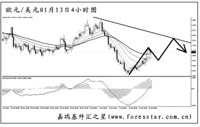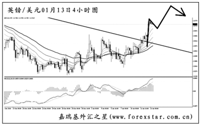 ▲歐元兌美元小幅創出日線圖新低之后未能加速下行,短線反彈的斜率較大。圖中下降趨勢線為日線圖形成,由于均線系統已被升破,后市歐元有望直接挑戰趨勢線的阻力作用。短線存在一波做多機會,但穩健投資者還是等待歐元上調到位后繼續順勢做空為好。