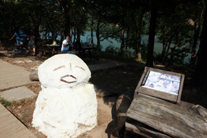 從音樂博物館后門出來,一大片碧綠的青草地就在眼前。綠草茵茵,樹木環繞,分外怡情。而穿過大草坪,就看到湖邊立著個可愛的大雪人,還有一條長凳。這就是《冬季戀歌》中主人公留下初吻回憶的地方,可愛的雪人正是他們的杰作,旁邊還擺放著兩位主角的照片。坐在長凳上,看著他們含情脈脈的笑容,撫摸著潔白的雪人,重溫“戀歌”場景,再次感受到了純真初戀的美好。