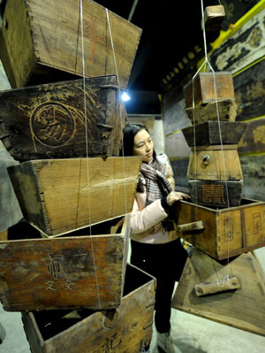 家住重慶市渝中區枇杷山正街101號的劉光瑞是一位匾收藏愛好者,他收藏了云、貴、川、渝地區自明、清以來的各類匾3000余塊,創辦的重慶巴渝名匾文化藝術博物館預計4月正式開館迎客。圖為一觀眾正在館內觀賞各個時期刻有字的量具“斗”。