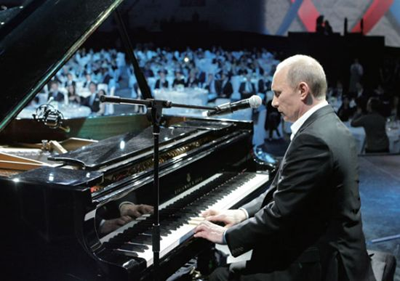 在圣彼得堡慈善晚會上,主持人邀請普京上臺表演,普京說:“如同大多數人一樣,我不會唱歌跳舞!比欢,他走到臺上一架鋼琴前,用那強健的十指以及略顯尖薄的聲線自彈自唱起來。當然,世人無不稱給力,無不感嘆當年克格勃培訓系統的水平之高。